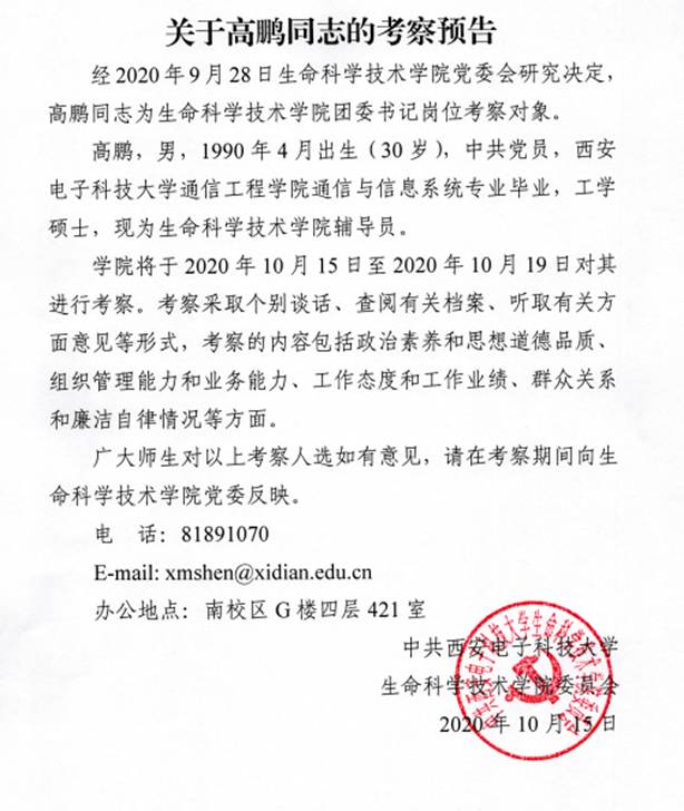 关于高鹏同志的考察预告